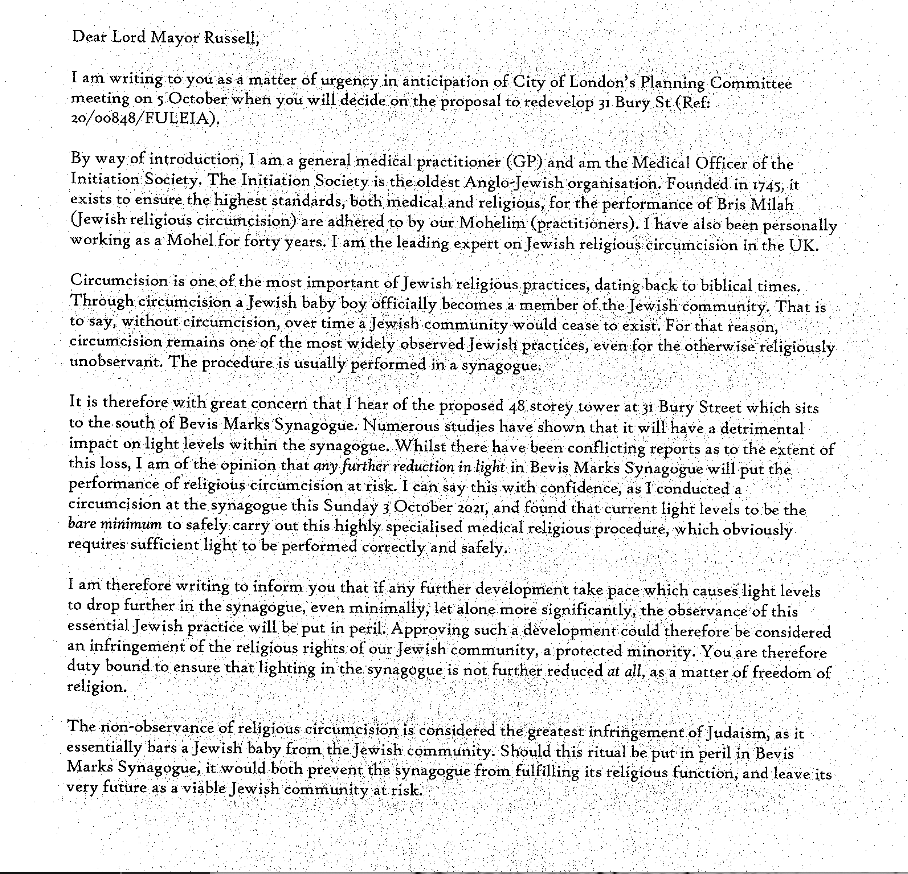 In a letter (seen on the left) to the Lord Mayor of London in 2021, Dr J Spitzer, a prominent mohel (the Hebrew name given to those who conduct the procedure), stated that: “if any further development takes place which causes light levels to drop further in the synagogue, even minimally, let alone more significantly, the observance of this essential Jewish practice will be put in peril.”