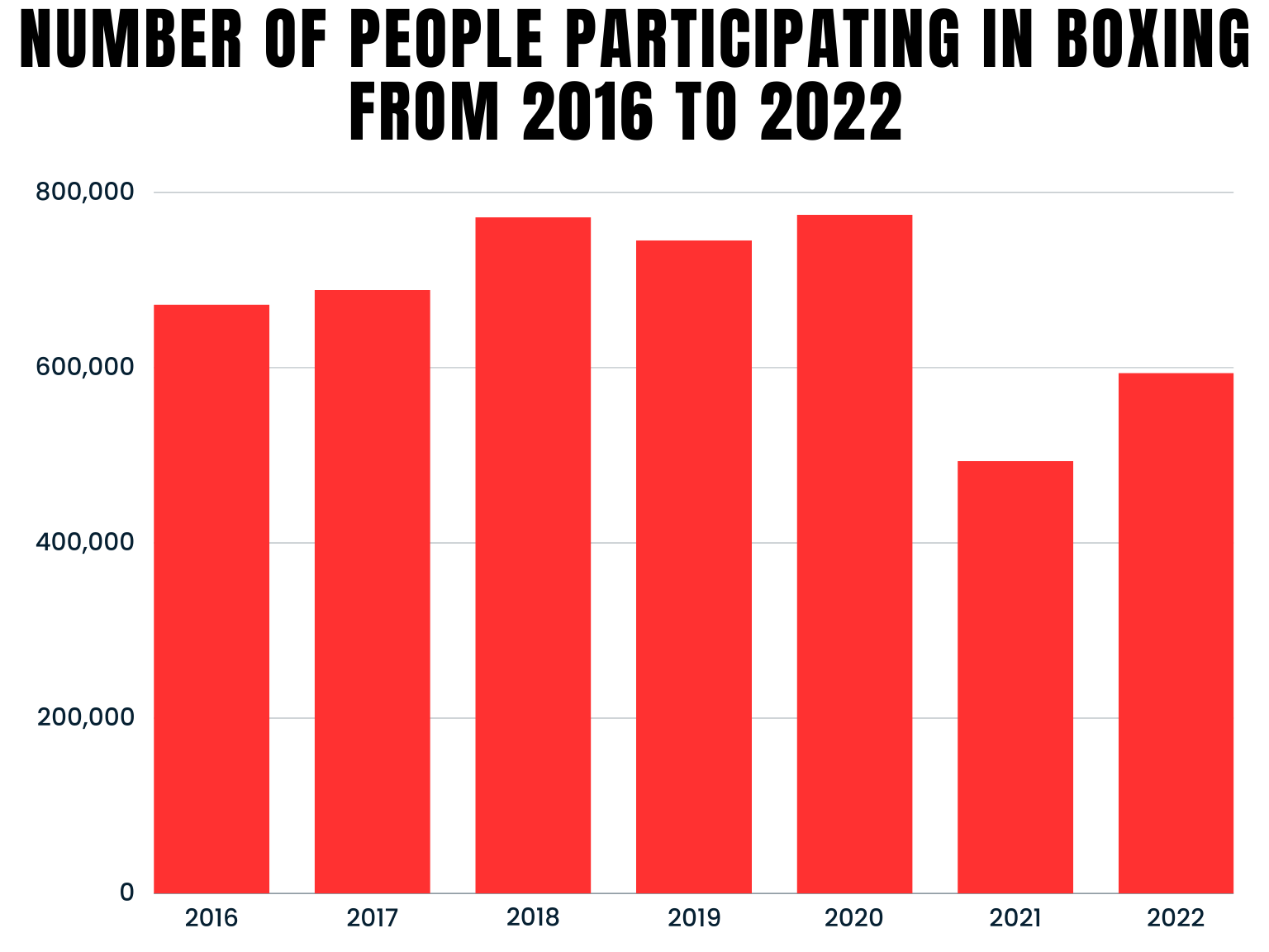 In fact, in 2021 the number of people participating in boxing aged 16 or older dropped to 493,000, around 300,000 less than in 2020 and the lowest its been in several years.