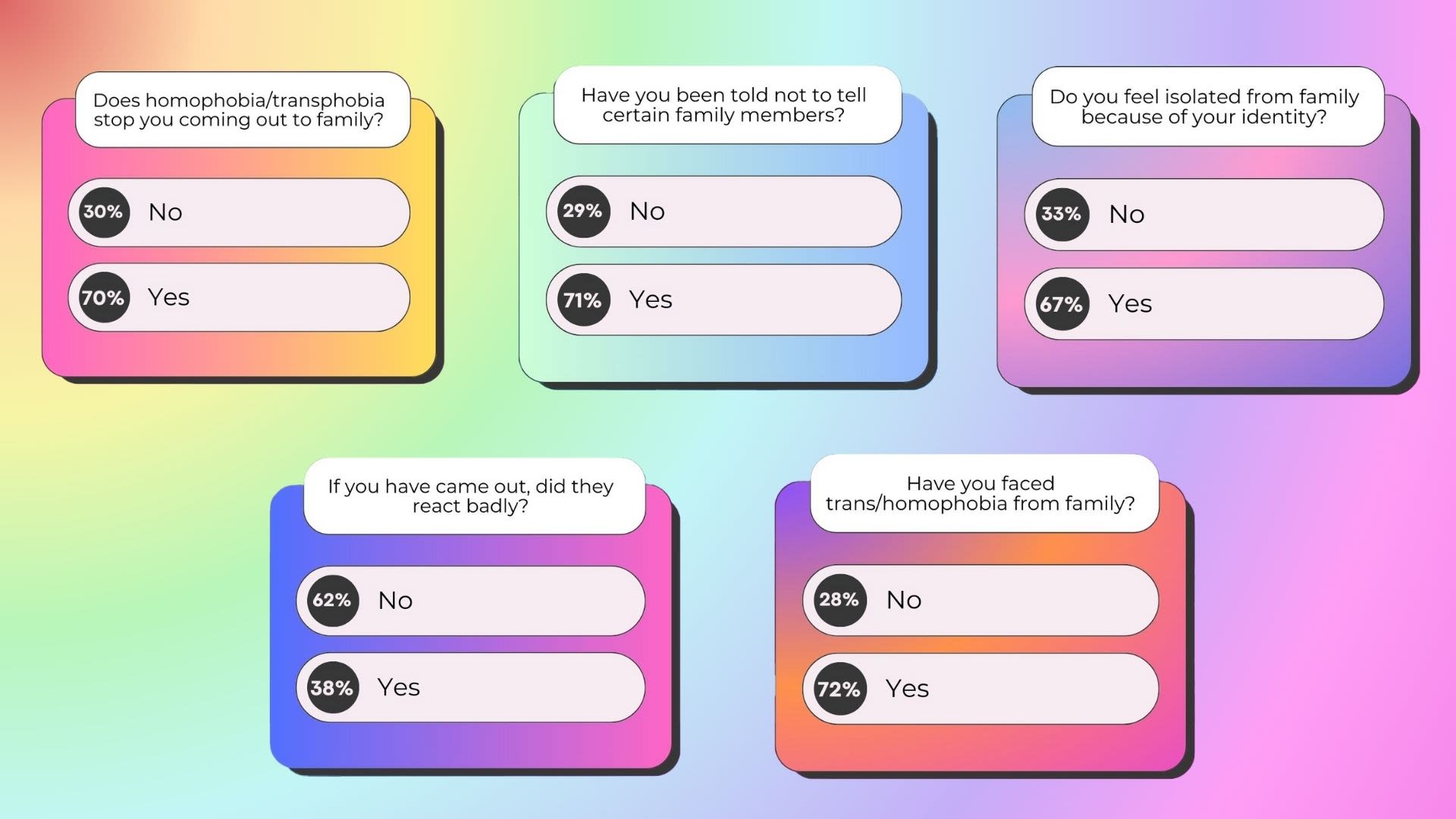 Furthermore, it was reported that 14% of queer people said they are not close with their immediate family, compared with 6% for straight people.