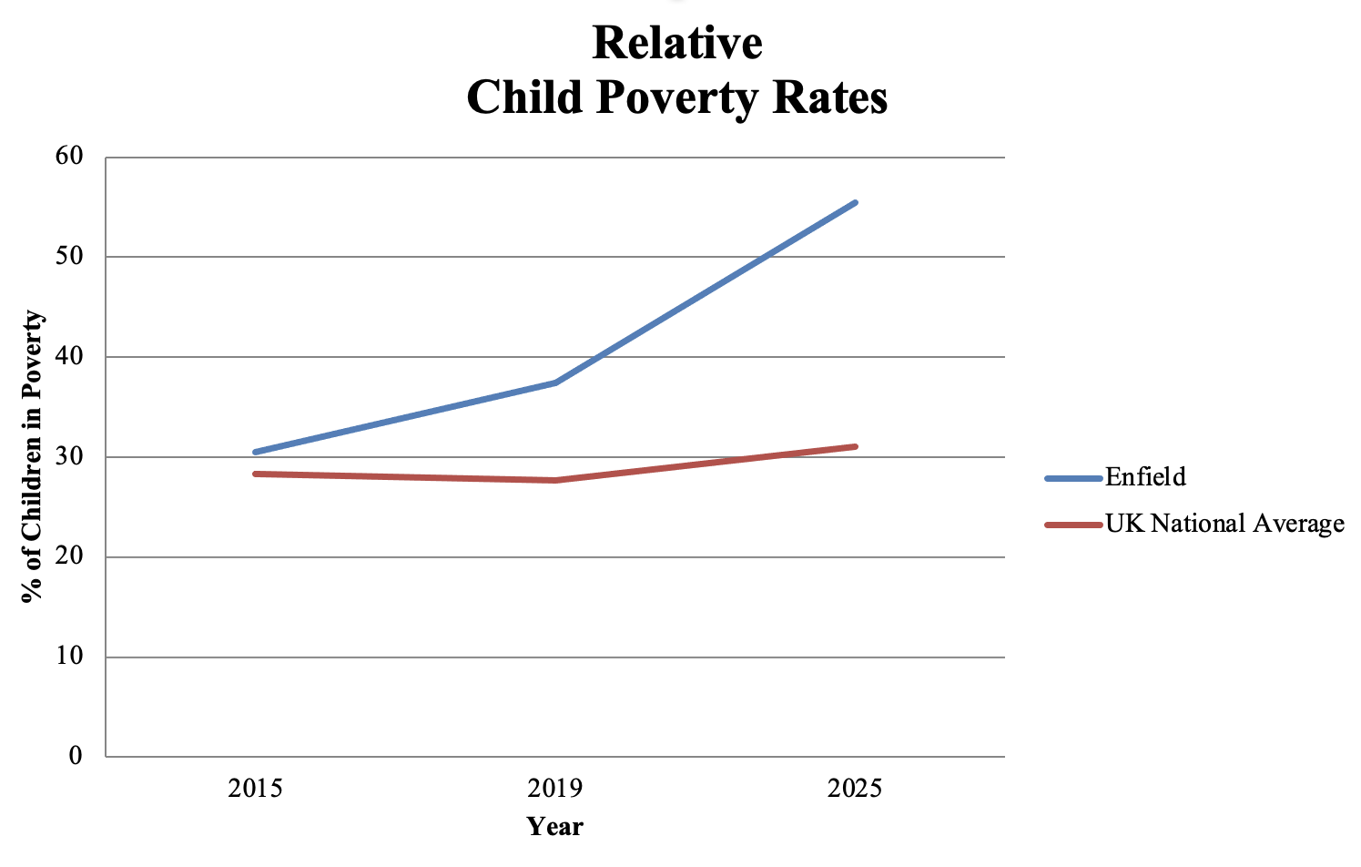 In 2015, Enfield’s number of children in income deprived families sat marginally higher than the national average. Whilst the national numbers have remained somewhat similar, Enfield’s levels of deprived children have skyrocketed. Across many measurements, there is no denying the truth that the majority of people in Enfield have got poorer.