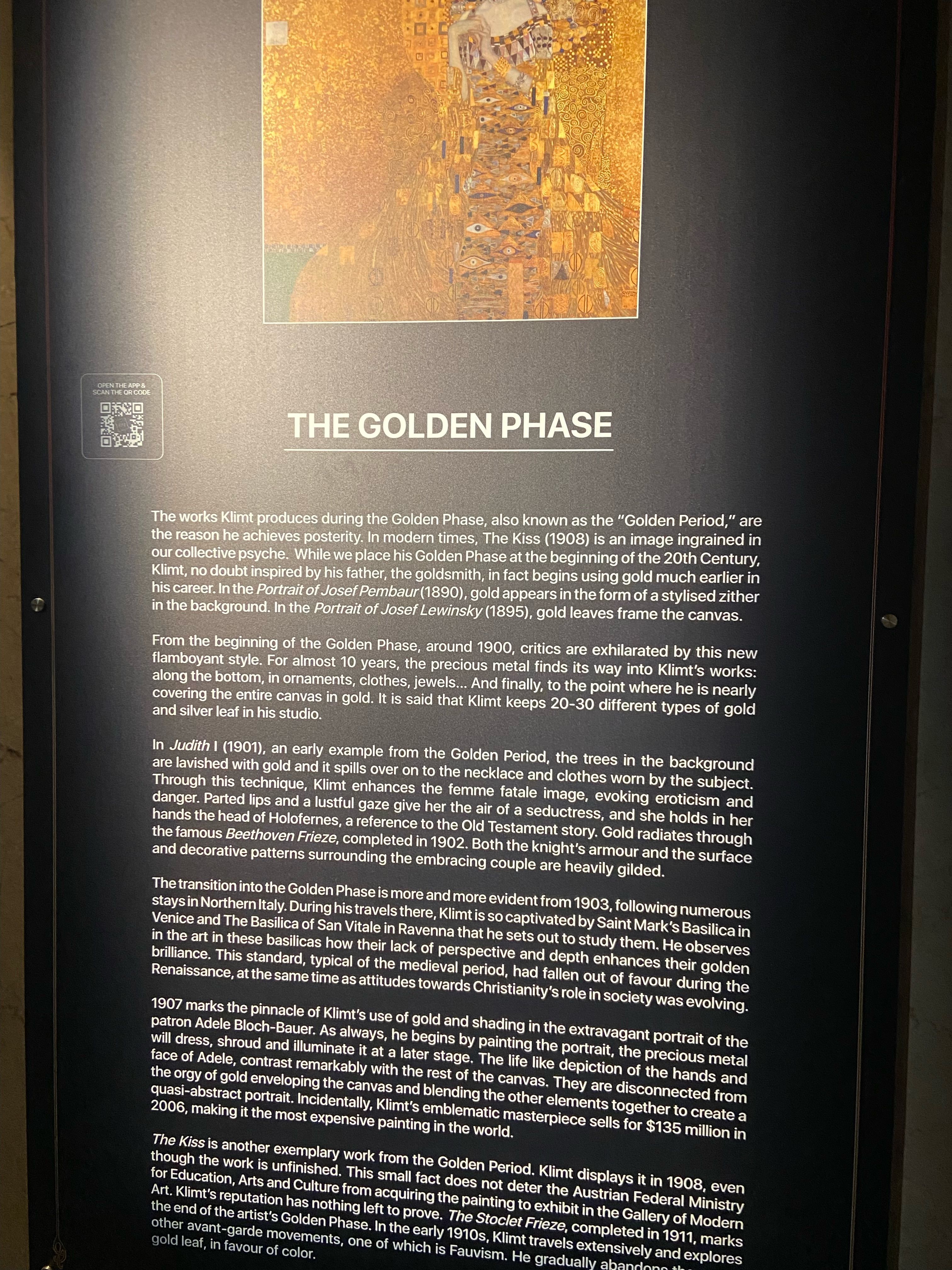 A column of text in the 'Art & Life' room of the KIimt Expo which describes Klimt's infamous 'Golden phase' of painting.