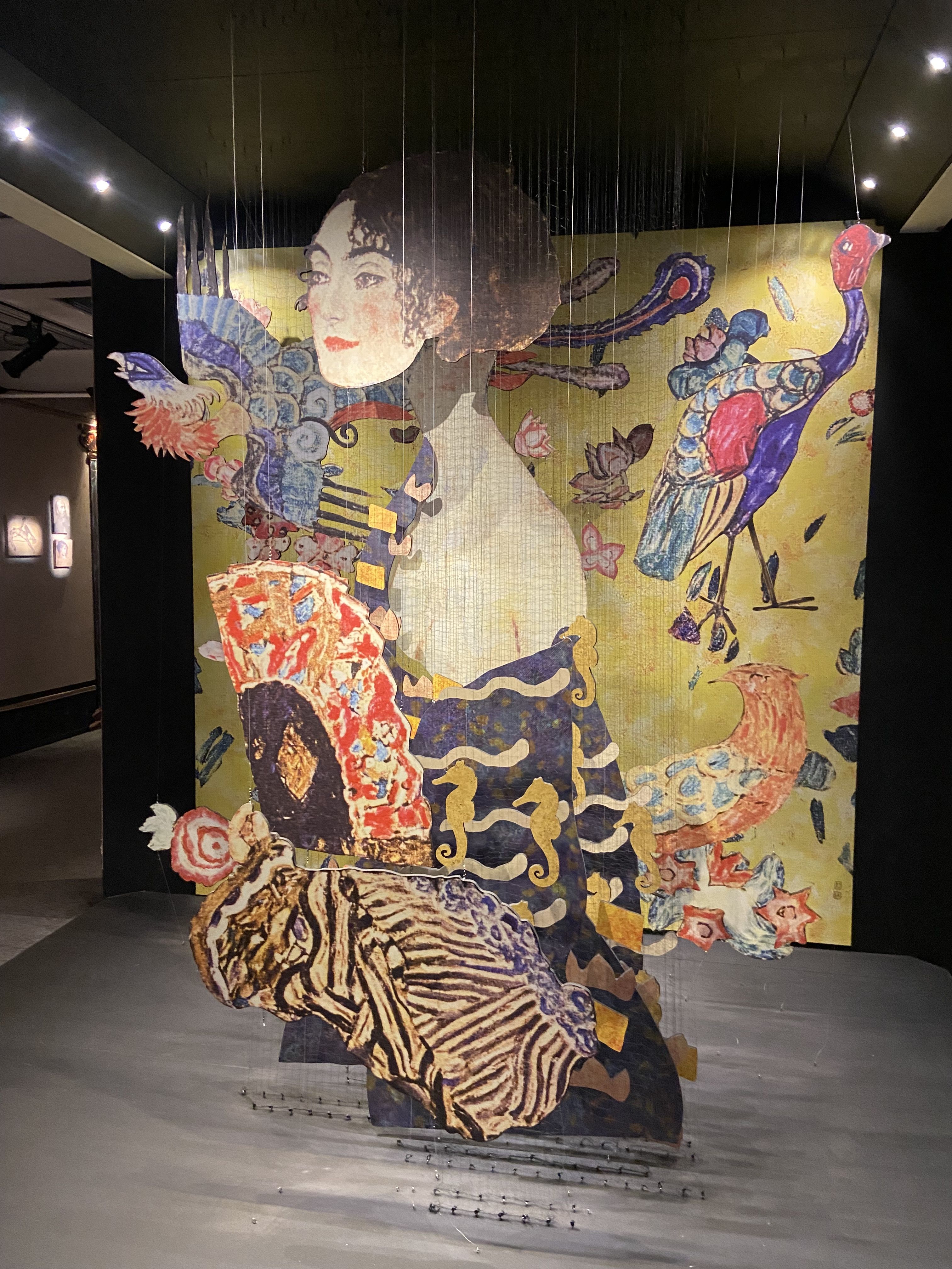 The 'Lady with Fan' 3D collage in the first room of the Klimt Expo