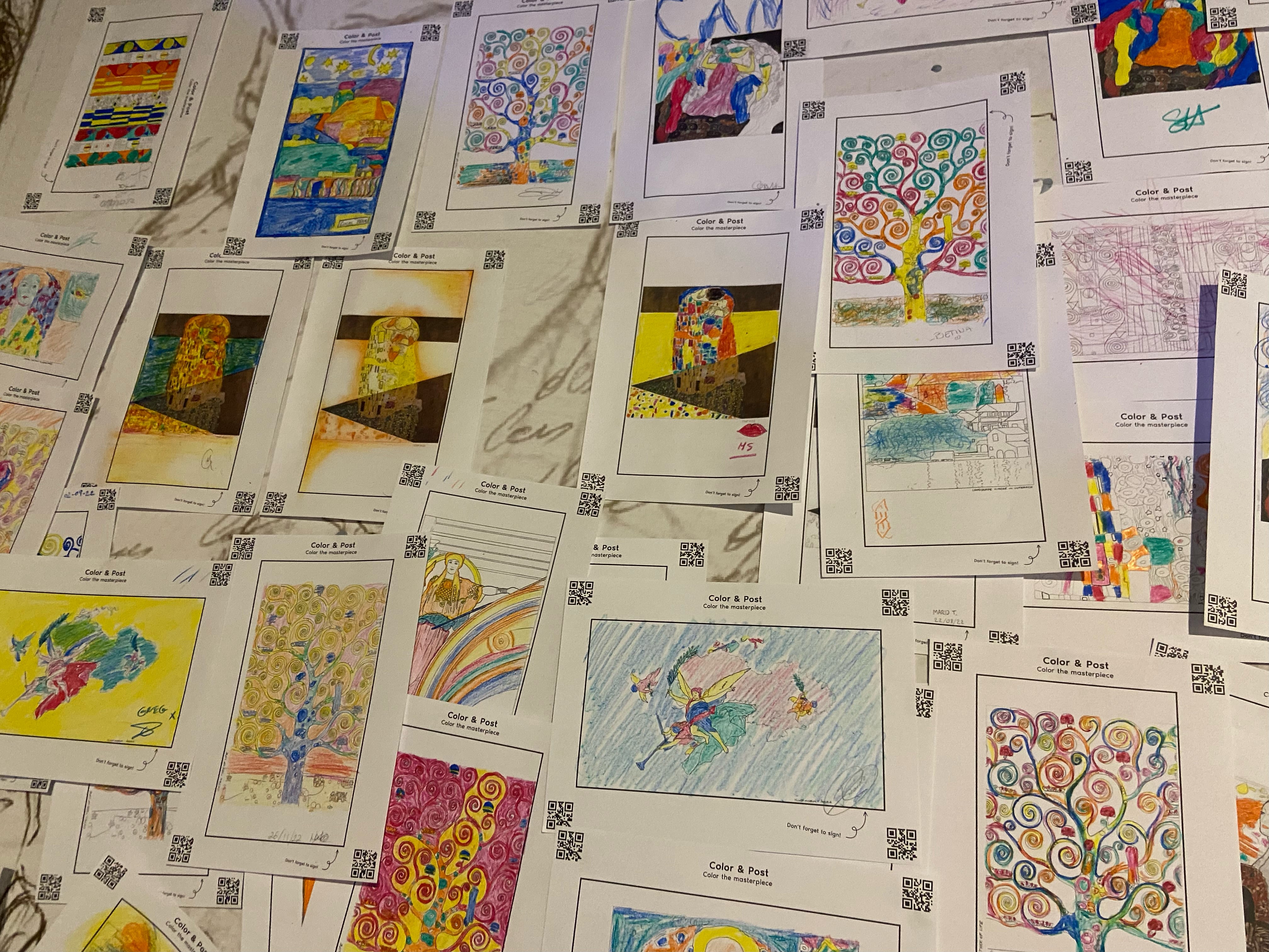 The colouring-in station in the last room of the Klimt: The immersive experience exhibition.
