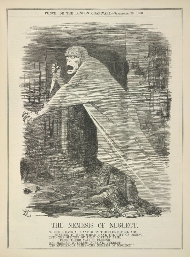 Punch's 1888 cartoon, The Nemesis of Neglect, linked Whitechapel's poverty to the Jack the Ripper murders. (Illustration: Accessed via Wikimedia Commons. The image is in the public domain.)