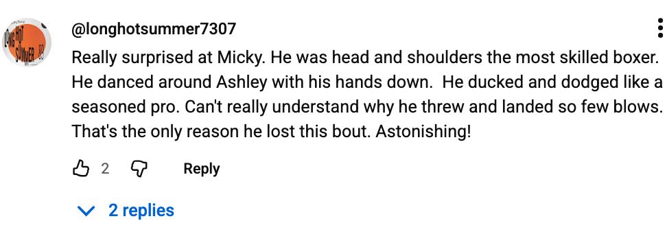 I agree. Mickey usually throws more punches – a fact I know well, given that he’s my own boxing coach. I see that he has replied to the comment. It reads: “Hey amigo! That was my 1st ever fight as a journeyman."