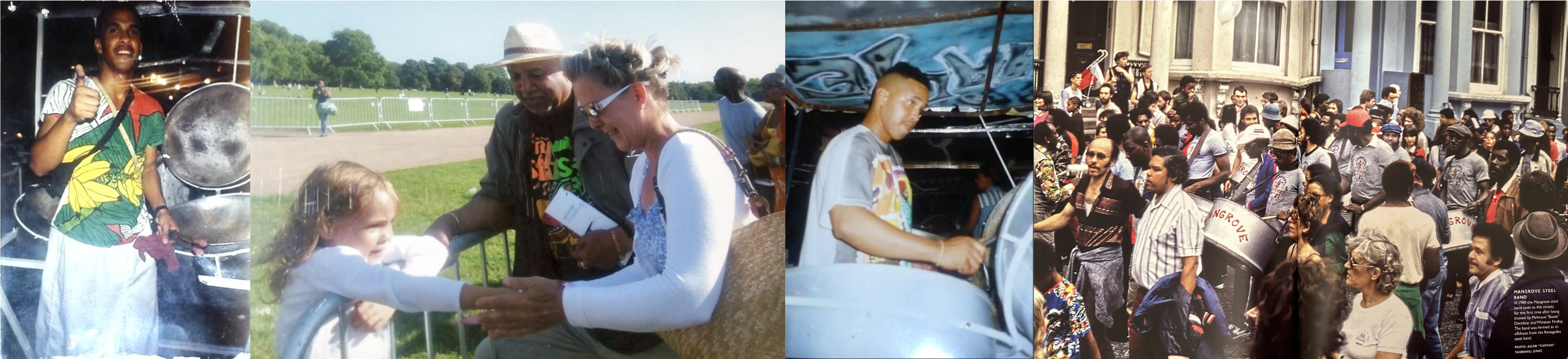 1. My dad winning Trinidad Panorama - the first win by an unsponsored team (1987) 2. Me, my grandad and my mum at Panorama in Hyde Park (2007) 3. My dad playing pan in Trinidad 4. Mangrove steel band at Notting Hill Carnival the first time after being trained by my uncle Winston Findlay (1980) - excerpt from Carnival: A Photographic and Testimonial History