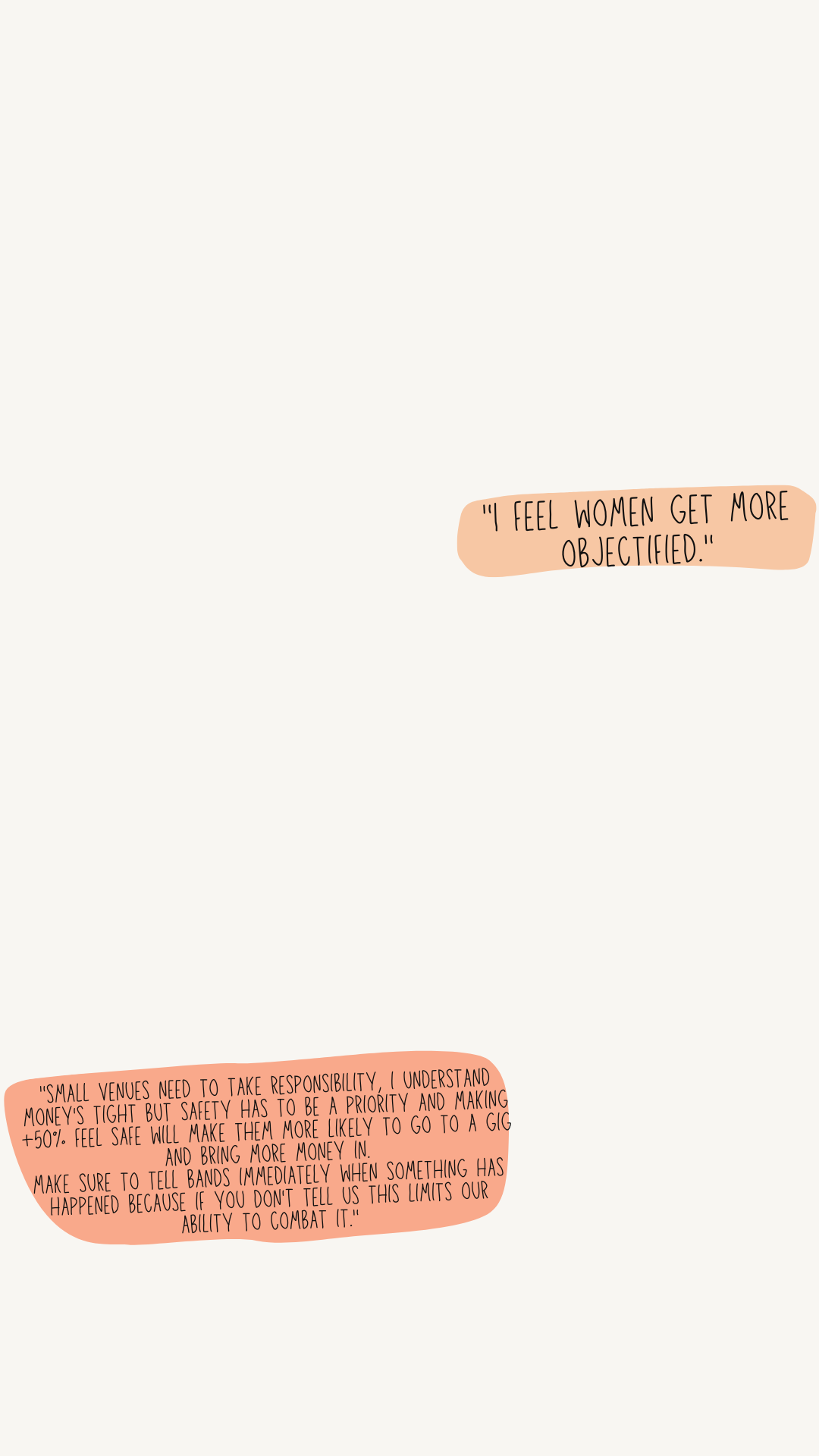 57% of the women and queer people I interviewed reported that they do not feel safe while at gigs, festivals or concerts, whereas only 33% of cis men said they felt unsafe.
