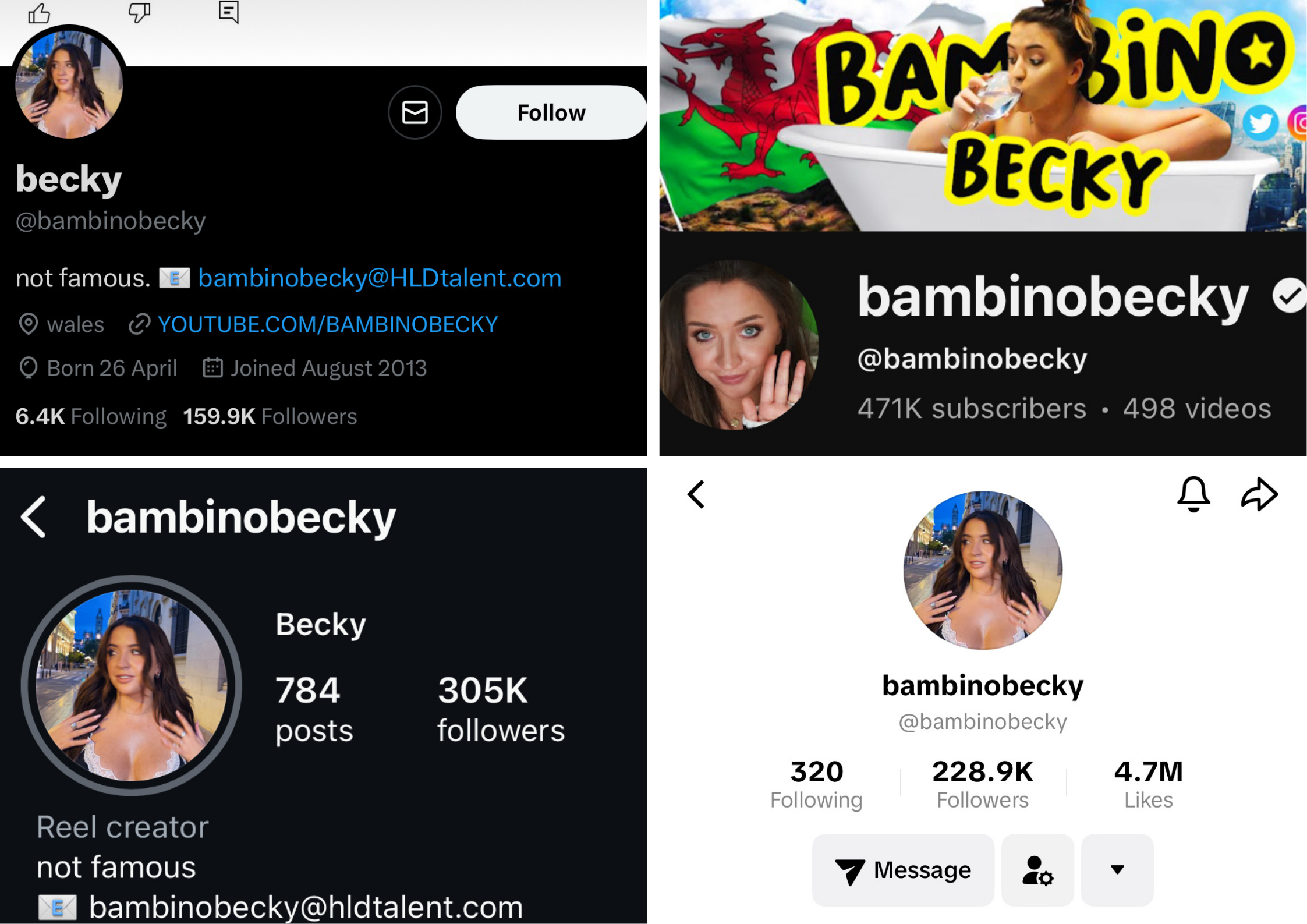 Becky's current (June 2025) social media following. Top left: X, Top right: YouTube, Bottom left: Instagram, Bottom right: TikTok