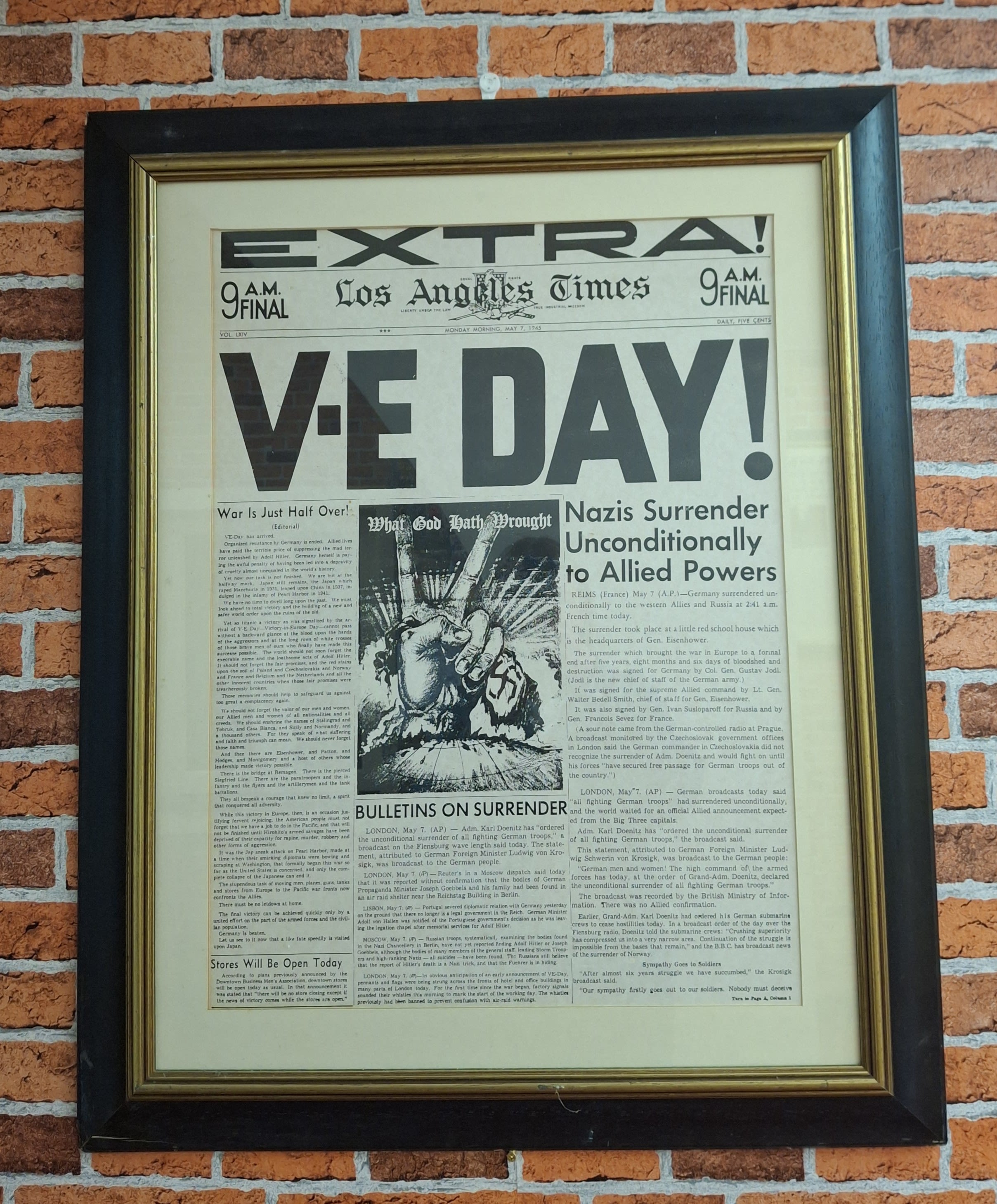 Front page of the Los Angeles Times celebrates VE Day, on display at the Lincolsnfields Centre. Photo: Izzie Addison.